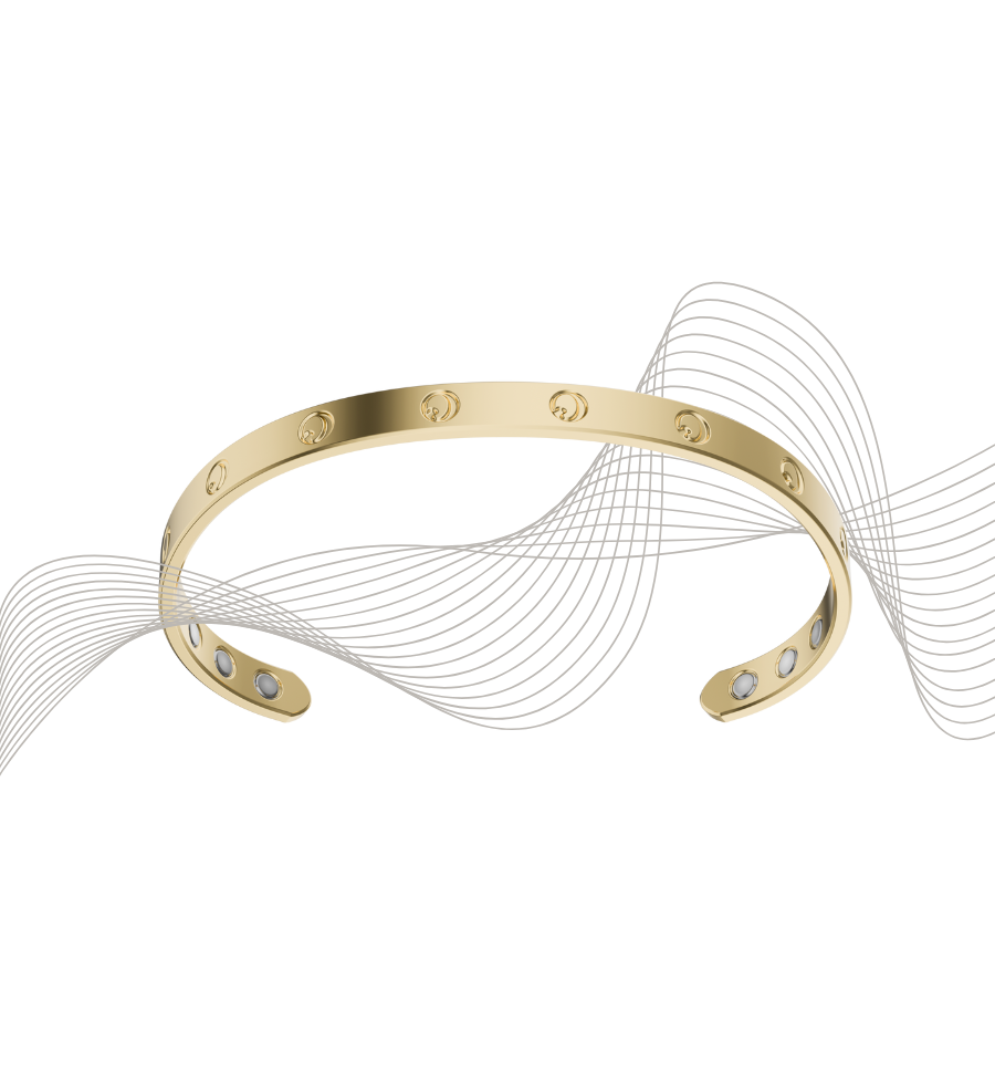 Disconnect from smartphones and apps. Embrace a natural and elegant approach to elevate your health. How is this possible? Through six dynamic magnets that interact with your body’s natural magnetic field — creating a gentle, continuous force to support your well-being. All elegantly crafted and finished in 18K gold plating.